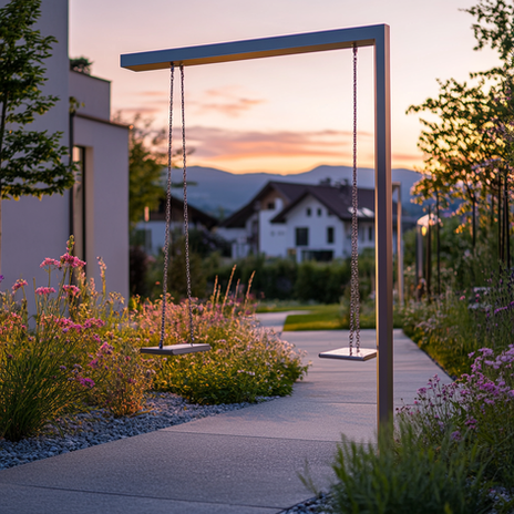 Unsere freistehenden L-Profile aus pulverbeschichtetem Aluminium sind weit mehr als tragende Elemente – sie sind ein Statement im Außenraum. Ob als stilvolle Schaukelaufhängung, als Skulptur, Pergola oder Lichtobjekt.